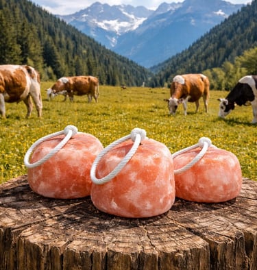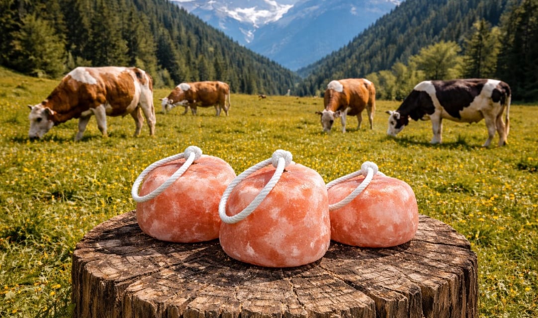 Blocks of Himalayan salt stacked neatly on rustic wooden shelves
